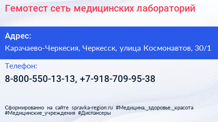 Гемотест, сеть медицинских лабораторий по адресу Карачаево-Черкесия, Черкесск, улица Космонавтов, 30/1 в дальнейшем Организация, размещена в следующих категориях: