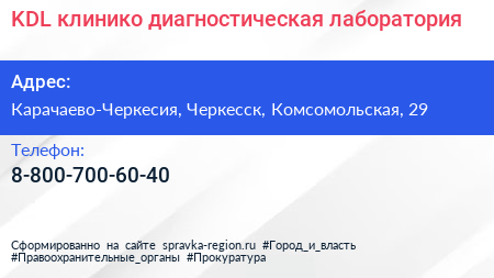KDL, клинико-диагностическая лаборатория по адресу Карачаево-Черкесия, Черкесск, Комсомольская, 29 в дальнейшем Организация, размещена в следующих категориях: