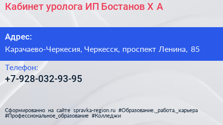 Кабинет уролога, ИП Бостанов Х.А. по адресу Карачаево-Черкесия, Черкесск, проспект Ленина, 85 в дальнейшем Организация, размещена в следующих категориях: