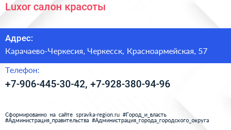 Luxor, салон красоты по адресу Карачаево-Черкесия, Черкесск, Красноармейская, 57 в дальнейшем Организация, размещена в следующих категориях: