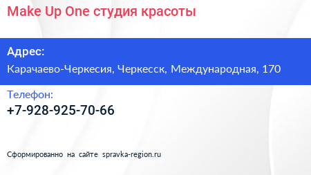 Make Up One, студия красоты по адресу Карачаево-Черкесия, Черкесск, Международная, 170 в дальнейшем Организация, размещена в следующих категориях: