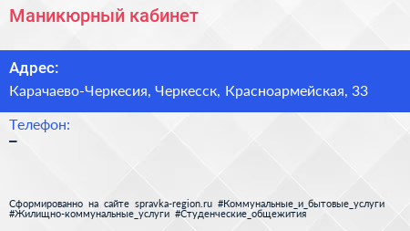 Маникюрный кабинет по адресу Карачаево-Черкесия, Черкесск, Красноармейская, 33 в дальнейшем Организация, размещена в следующих категориях: