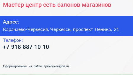 Мастер-центр, сеть салонов-магазинов по адресу Карачаево-Черкесия, Черкесск, проспект Ленина, 21 в дальнейшем Организация, размещена в следующих категориях: