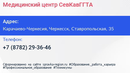 Медицинский центр, СевКавГГТА по адресу Карачаево-Черкесия, Черкесск, Ставропольская, 35 в дальнейшем Организация, размещена в следующих категориях: