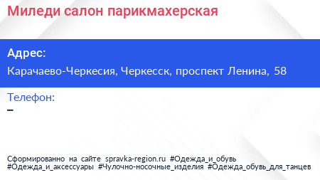 Миледи, салон-парикмахерская по адресу Карачаево-Черкесия, Черкесск, проспект Ленина, 58 в дальнейшем Организация, размещена в следующих категориях: