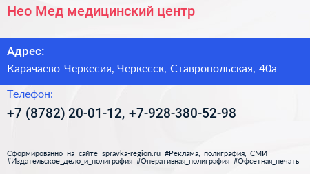 Нео-Мед, медицинский центр по адресу Карачаево-Черкесия, Черкесск, Ставропольская, 40а в дальнейшем Организация, размещена в следующих категориях: