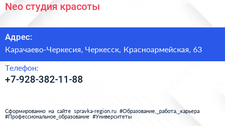 Neo, студия красоты по адресу Карачаево-Черкесия, Черкесск, Красноармейская, 63 в дальнейшем Организация, размещена в следующих категориях: