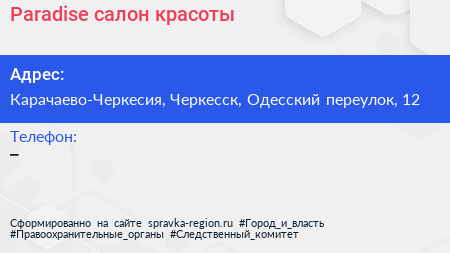 Paradise, салон красоты по адресу Карачаево-Черкесия, Черкесск, Одесский переулок, 12 в дальнейшем Организация, размещена в следующих категориях: