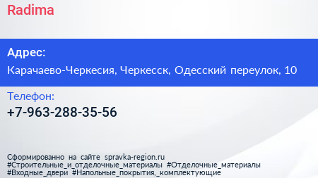 Radima по адресу Карачаево-Черкесия, Черкесск, Одесский переулок, 10 в дальнейшем Организация, размещена в следующих категориях: