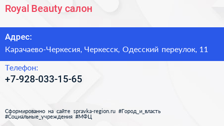 Royal Beauty, салон по адресу Карачаево-Черкесия, Черкесск, Одесский переулок, 11 в дальнейшем Организация, размещена в следующих категориях: