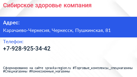 Сибирское здоровье, компания по адресу Карачаево-Черкесия, Черкесск, Пушкинская, 81 в дальнейшем Организация, размещена в следующих категориях: