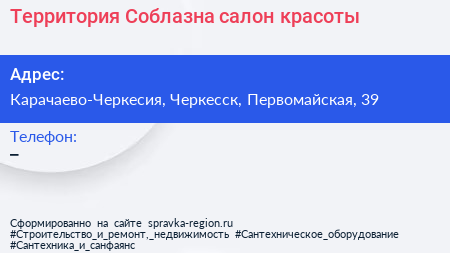 Территория Соблазна, салон красоты по адресу Карачаево-Черкесия, Черкесск, Первомайская, 39 в дальнейшем Организация, размещена в следующих категориях: