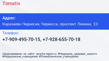 Tomatis по адресу Карачаево-Черкесия, Черкесск, проспект Ленина, 13 в дальнейшем Организация, размещена в следующих категориях: