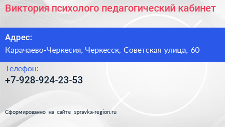 Виктория, психолого-педагогический кабинет по адресу Карачаево-Черкесия, Черкесск, Советская улица, 60 в дальнейшем Организация, размещена в следующих категориях:
