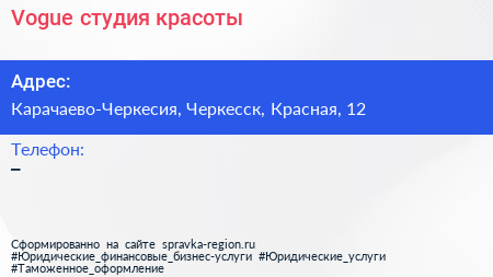 Vogue, студия красоты по адресу Карачаево-Черкесия, Черкесск, Красная, 12 в дальнейшем Организация, размещена в следующих категориях: