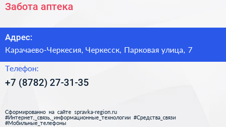 Забота, аптека по адресу Карачаево-Черкесия, Черкесск, Парковая улица, 7 в дальнейшем Организация, размещена в следующих категориях: