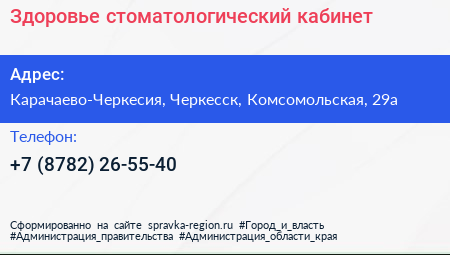 Здоровье, стоматологический кабинет по адресу Карачаево-Черкесия, Черкесск, Комсомольская, 29а в дальнейшем Организация, размещена в следующих категориях: