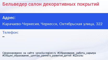 Бельведер, салон декоративных покрытий по адресу Карачаево-Черкесия, Черкесск, Октябрьская улица, 322 в дальнейшем Организация, размещена в следующих категориях: