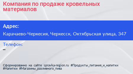 Компания по продаже кровельных материалов по адресу Карачаево-Черкесия, Черкесск, Октябрьская улица, 347 в дальнейшем Организация, размещена в следующих категориях: