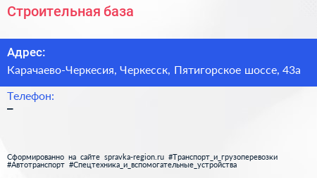 Строительная база по адресу Карачаево-Черкесия, Черкесск, Пятигорское шоссе, 43а в дальнейшем Организация, размещена в следующих категориях: