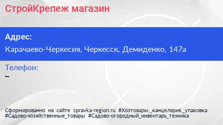 СтройКрепеж, магазин по адресу Карачаево-Черкесия, Черкесск, Демиденко, 147а в дальнейшем Организация, размещена в следующих категориях: