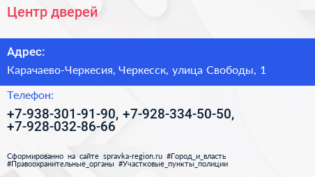 Центр дверей по адресу Карачаево-Черкесия, Черкесск, улица Свободы, 1 в дальнейшем Организация, размещена в следующих категориях: