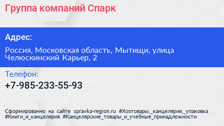 Группа компаний Спарк по адресу Россия, Московская область, Мытищи, улица Челюскинский Карьер, 2 в дальнейшем Организация, размещена в следующих категориях:
