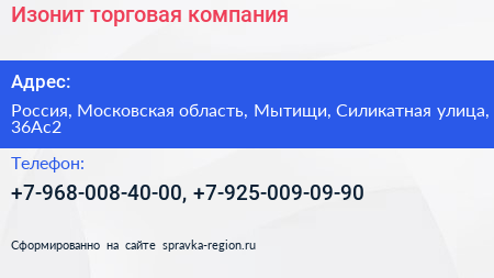 Изонит, торговая компания по адресу Россия, Московская область, Мытищи, Силикатная улица, 36Ас2 в дальнейшем Организация, размещена в следующих категориях: