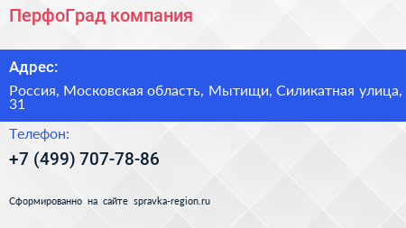 ПерфоГрад, компания по адресу Россия, Московская область, Мытищи, Силикатная улица, 31 в дальнейшем Организация, размещена в следующих категориях: