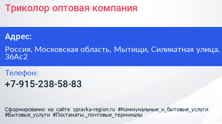 Триколор, оптовая компания по адресу Россия, Московская область, Мытищи, Силикатная улица, 36Ас2 в дальнейшем Организация, размещена в следующих категориях: