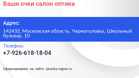 Ваши очки, салон оптики по адресу 142432, Московская область, Черноголовка, Школьный бульвар, 10 в дальнейшем Организация, размещена в следующих категориях: