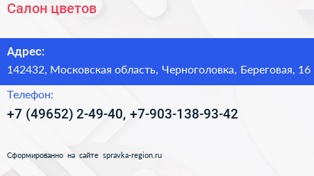 Салон цветов по адресу 142432, Московская область, Черноголовка, Береговая, 16 в дальнейшем Организация, размещена в следующих категориях: