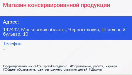 Магазин консервированной продукции по адресу 142432, Московская область, Черноголовка, Школьный бульвар, 10 в дальнейшем Организация, размещена в следующих категориях: