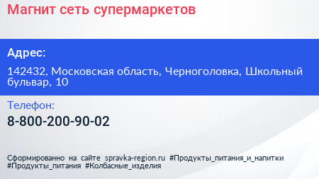 Магнит, сеть супермаркетов по адресу 142432, Московская область, Черноголовка, Школьный бульвар, 10 в дальнейшем Организация, размещена в следующих категориях: