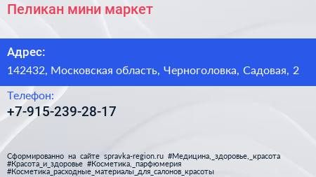 Пеликан, мини-маркет по адресу 142432, Московская область, Черноголовка, Садовая, 2 в дальнейшем Организация, размещена в следующих категориях: