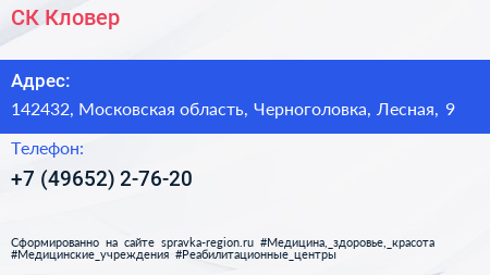 СК Кловер по адресу 142432, Московская область, Черноголовка, Лесная, 9 в дальнейшем Организация, размещена в следующих категориях: