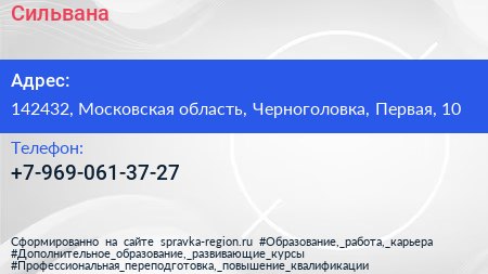 Сильвана по адресу 142432, Московская область, Черноголовка, Первая, 10 в дальнейшем Организация, размещена в следующих категориях: