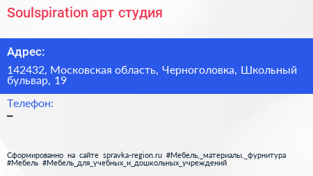 Soulspiration, арт-студия по адресу 142432, Московская область, Черноголовка, Школьный бульвар, 19 в дальнейшем Организация, размещена в следующих категориях: