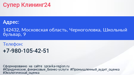 Супер-Клининг24 по адресу 142432, Московская область, Черноголовка, Школьный бульвар, 9 в дальнейшем Организация, размещена в следующих категориях: