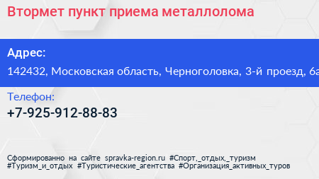 Втормет, пункт приема металлолома по адресу 142432, Московская область, Черноголовка, 3-й проезд, 6а в дальнейшем Организация, размещена в следующих категориях: