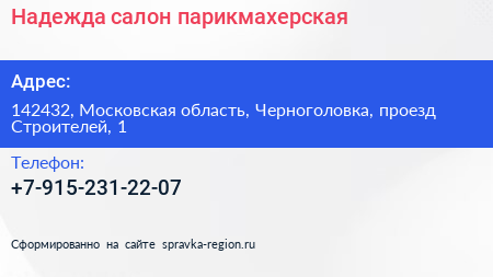 Надежда, салон-парикмахерская по адресу 142432, Московская область, Черноголовка, проезд Строителей, 1 в дальнейшем Организация, размещена в следующих категориях: