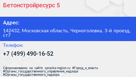 Бетонстройресурс №5 по адресу 142432, Московская область, Черноголовка, 3-й проезд, ст7 в дальнейшем Организация, размещена в следующих категориях: