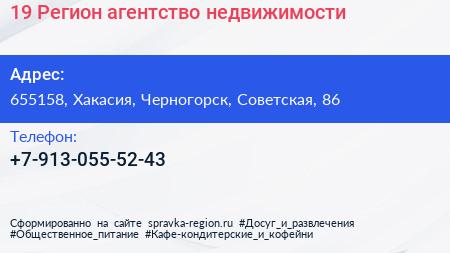 19 Регион, агентство недвижимости по адресу 655158, Хакасия, Черногорск, Советская, 86 в дальнейшем Организация, размещена в следующих категориях: