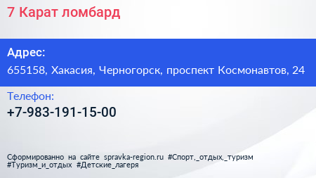 7 Карат, ломбард по адресу 655158, Хакасия, Черногорск, проспект Космонавтов, 24 в дальнейшем Организация, размещена в следующих категориях: