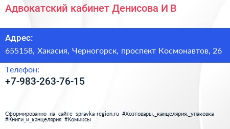 Адвокатский кабинет Денисова И.В. по адресу 655158, Хакасия, Черногорск, проспект Космонавтов, 26 в дальнейшем Организация, размещена в следующих категориях: