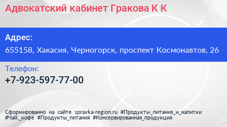 Адвокатский кабинет Гракова К.К. по адресу 655158, Хакасия, Черногорск, проспект Космонавтов, 26 в дальнейшем Организация, размещена в следующих категориях: