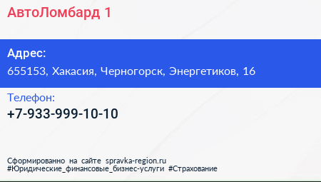 АвтоЛомбард №1 по адресу 655153, Хакасия, Черногорск, Энергетиков, 16 в дальнейшем Организация, размещена в следующих категориях:
