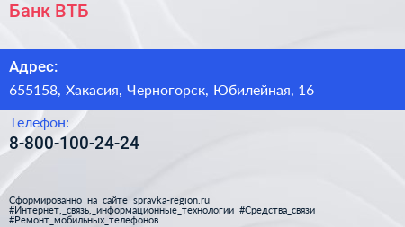 Банк ВТБ по адресу 655158, Хакасия, Черногорск, Юбилейная, 16 в дальнейшем Организация, размещена в следующих категориях: