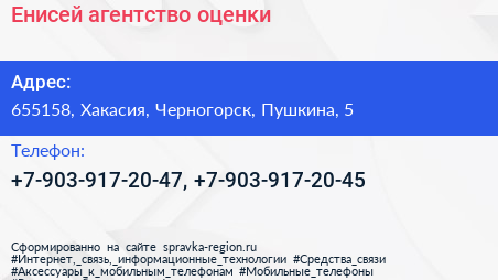 Енисей, агентство оценки по адресу 655158, Хакасия, Черногорск, Пушкина, 5 в дальнейшем Организация, размещена в следующих категориях: