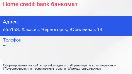Home credit bank, банкомат по адресу 655158, Хакасия, Черногорск, Юбилейная, 14 в дальнейшем Организация, размещена в следующих категориях: